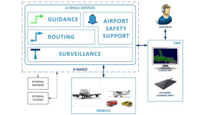 The Advanced Surface Movement Guidance and Control System (A-SMGCS) is a sophisticated system used at airports to enhance the safety and efficiency of aircraft and vehicle movements on the ground. It provides routing, guidance, and surveillance to ensure that the declared surface movement rate is maintained under all weather conditions and within the aerodrome visibility operational level (AVOL), prioritizing safety. A-SMGCS is modular, incorporating various functionalities to support safe and orderly movements, regardless of traffic density or aerodrome layout complexity. The system adapts to different visibility conditions, enabling effective control without requiring direct line-of-sight communication between controllers and aircraft or vehicles.